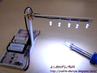 リード線の被覆だけをところどころ切り取りLEDのカソード(-)側と直接半田付けしています。わりばしとLEDの間を若干離している理由はLEDの出す“熱”がわりばしに悪さしないようにするためです。このように白色LEDを取り付けても白色LEDの後ろから回り込む、直接目に入る光はそれほど多くなく、これなら読書などにほとんど支障がないだろうと思いました。